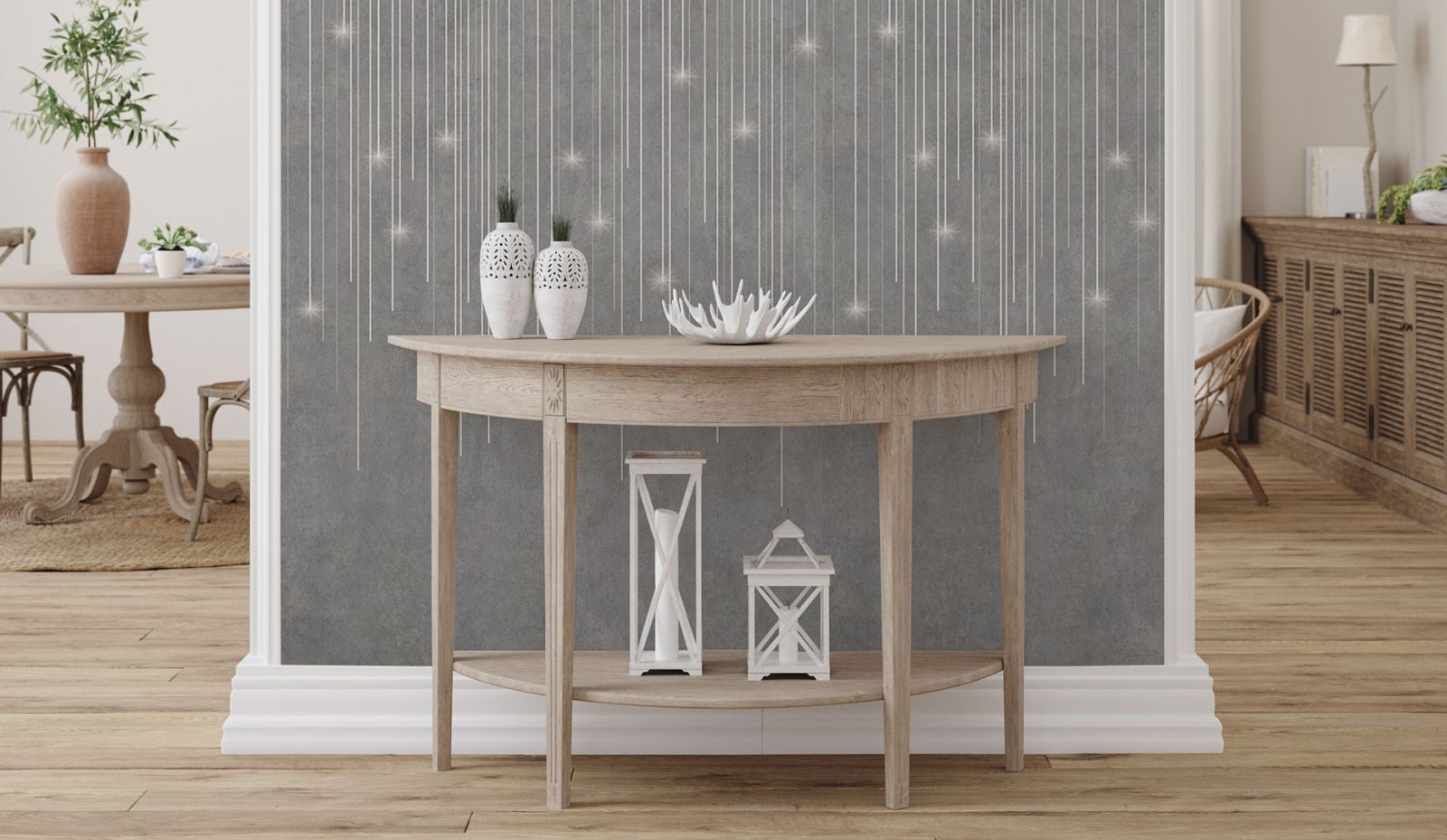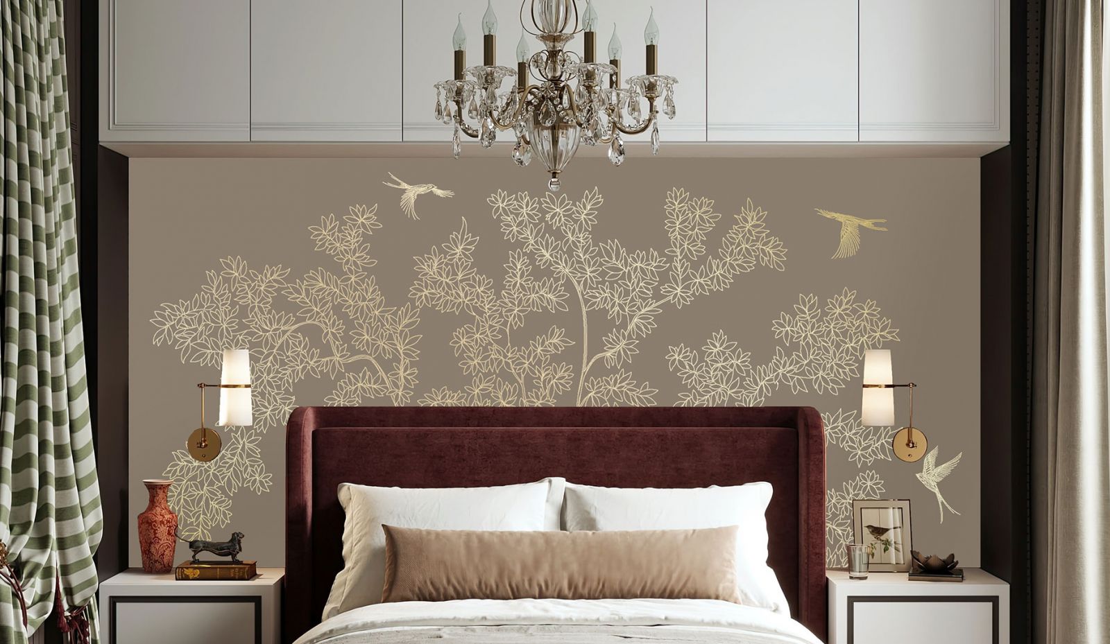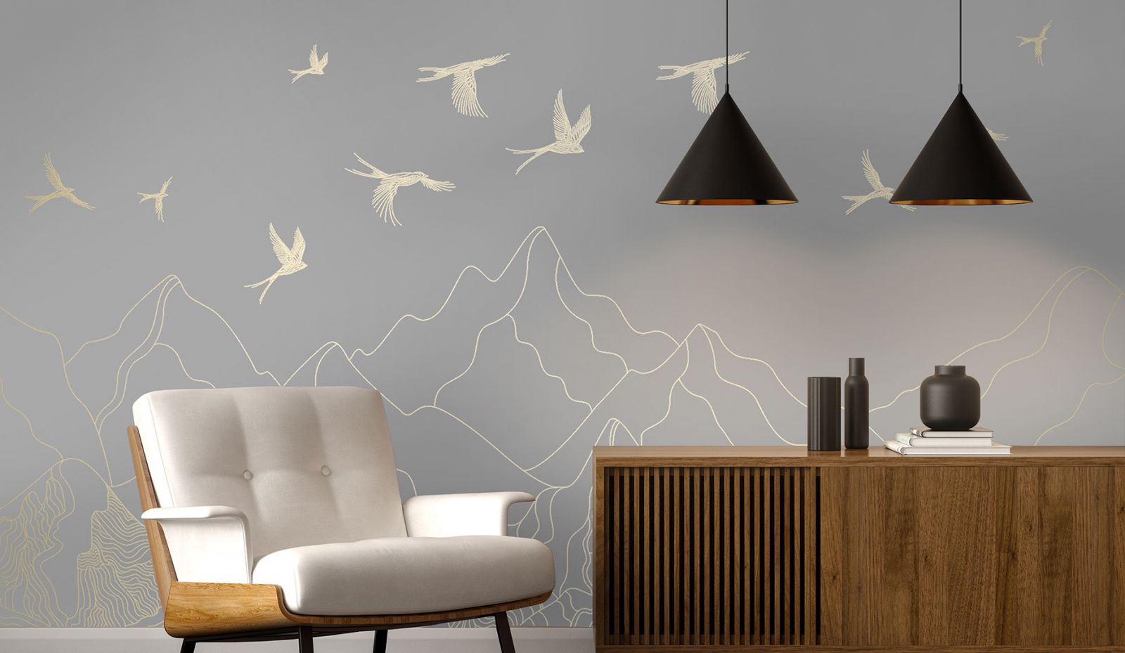 Как правило, стены в переходном стиле являются лёгким ненавязчивым фоном. Из материалов предпочтение отдаётся фактурной штукатурке, декоративному кирпичу с эффектом натуральной кладки, деревянным панелям. Чтобы привнести ту самую индивидуальность и изюминку в переходный интерьер, отличным выбором станут обои с лёгким ненавязчивым сюжетом. Гармоничные цветовые вариации, дизайнерские сюжеты на любую тематику (будь то классические узоры и вензеля или та же имитация природных текстур) позволят создать оригинальный акцент на определённой зоне вашего пространства, наполнят его смыслом и оригинальностью. К тому же, они максимально экологичны, подходят для размещения в спальнях и детских комнатах.