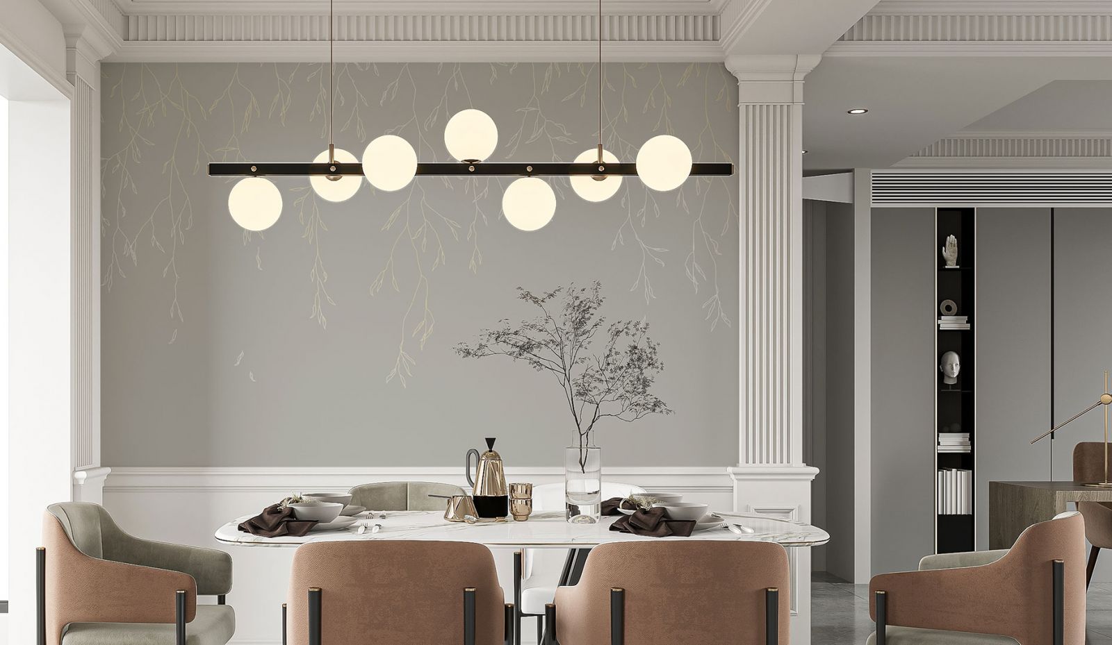 Освещение играет особую роль в создании интерьера в переходном стиле. Это именно тот элемент дизайна, который напомнит нам о классике, смелых объёмных формах и многоярусности. Люстра или крупный потолочный светильник выступают в качестве основного источника искусственного света. Но он всегда дополняется настольными светильниками, напольными торшерами. Приветствуется смелый баланс во всём: лаконичные или сложные формы, металл в сочетании со стеклом, тканью или бумагой. Переходный интерьер любит функциональность, поэтому освещения может и должно быть много.