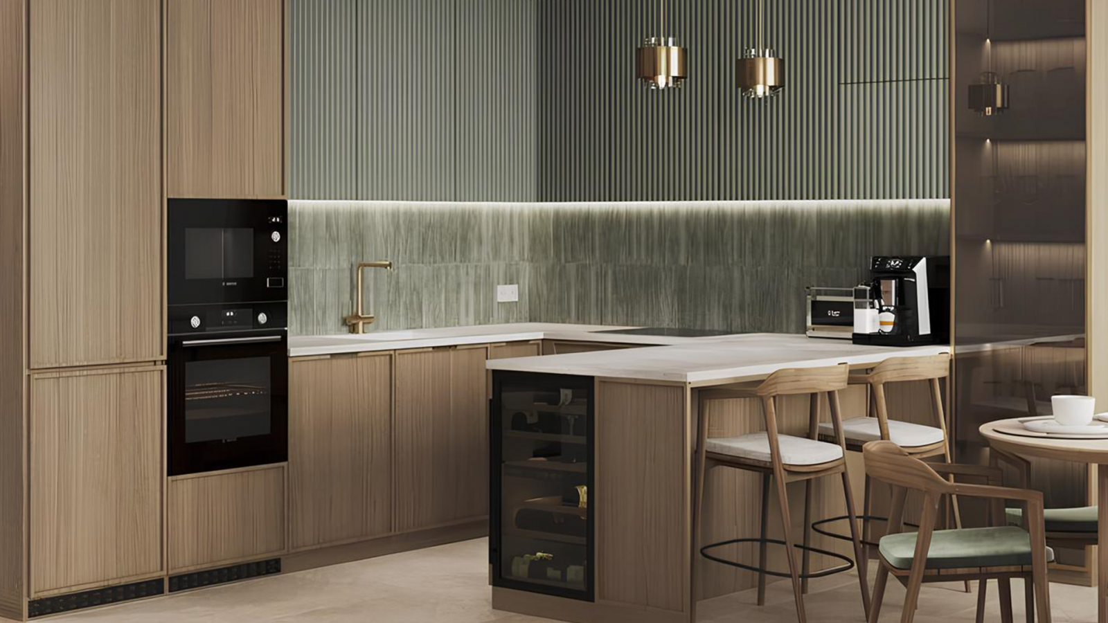 Это, по сути, любая из описанных схем, дополненная массивным столом-тумбой в центре кухни, который называют островом. Он служит дополнительной рабочей зоной, местом для хранения и даже обеденной площадкой. Такой подход значительно расширяет функциональность кухни, но требует достаточно большого пространства - обычно не менее 18–20 м². Важно, чтобы вокруг острова оставалось место для свободного перемещения и комфортной работы.